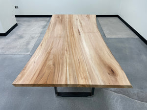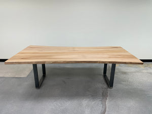 The live edge, wide-plank sycamore top provides a rustic yet modern look while the simple steel legs provide an aesthetic that will fit most any dining room.