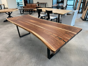 The live edge, wide-plank walnut top provides a rustic yet modern look while the simple steel legs provide an aesthetic that will fit most any dining room.